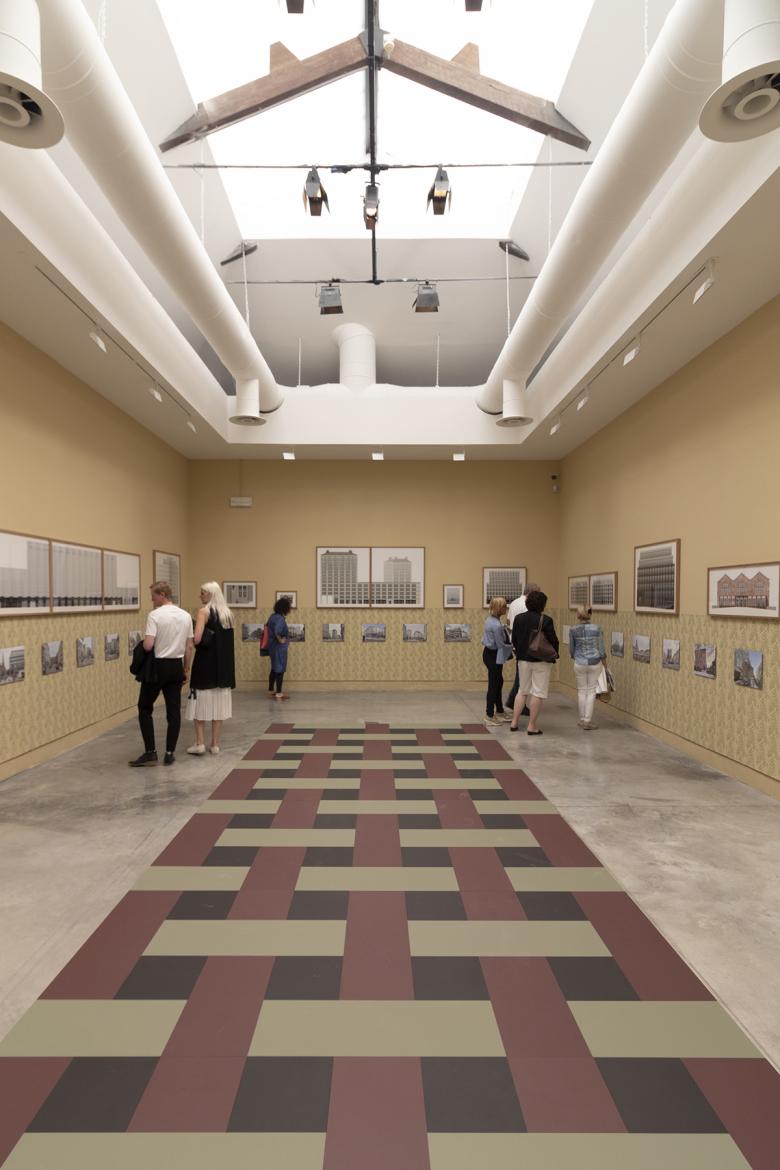 The flooring in the room for Caruso St. John Architects with Philip Heckhausen echoes the rectangular skylight overhead.