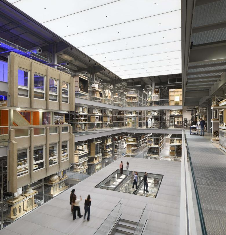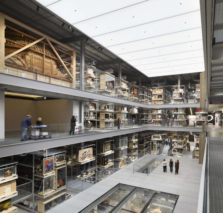 Evidence of a growing trend for arts institutions to make warehouses of art publicly accessible (see also: Depot Boijmans Van Beuningen, designed by MVRDV), V&A built the V&A East Storehouse as a four-story, 16,000-m2 (172,220-sf) “museum experience” with purpose-built storage for over 250,000 objects, 350,000 books and a thousand archives. It is housed inside Here East, the former media center designed by Allies & Morrison for the 2012 London Olympics. Pervading the competition-winning design by New York's Diller Scofidio + Renfro are glass floors, which allow visitors to see even more of the art, fashion, and other objects sitting on shelves, and give occasional glimpses of the V&A staff fetching objects for display or conservation; studios for the latter are aligned with V&A East Storehouse being as much a “working store” as a visitor attraction. Want to see something not on display? V&A's new Order an Object service enables anyone to book access to an object and see it for free, seven days a week.