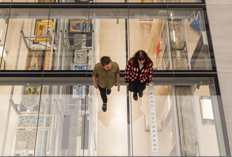 The 17th century Agra Colonnade, an extraordinary example of Mughal architecture from the bathhouse at the fort of Agra, visible through the Weston Collections Hall glass floor, and accessible via Object Encounters at V&A East Storehouse. (Photo: Hufton + Crow for V&A)