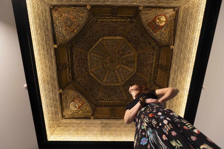 View of the exquisite 15th-century carved and gilded wooden ceiling, the Torrijos Ceiling, from the now lost Torrijos Palace in Spain, at V&A East Storehouse. (Photo: David Parry, PA Media Assignments)