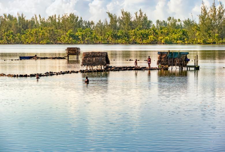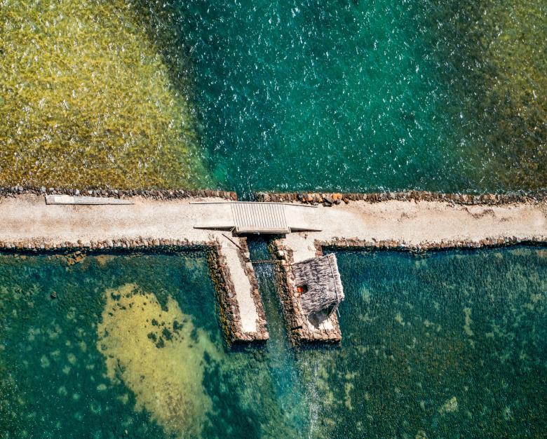 This tour of primarily brackish-water case studies continues with the Horo i‘a Fish Weirs of the Mā‘ohi in French Polynesia (above), stone-built weirs that are designed to harness tidal movement and capture fish as they enter or exit the lake. The weirs take on V, W, and A shapes when seen from above; these tapered forms funnel fish toward small openings and then channel them via labyrinthine walls toward wells, where they are collected by fishermen with nets. The stilted houses above the volcanic-stone walls allow the fishermen to monitor the weirs. To avoid overharvesting, the height of the walls are set below the water level at high tide, when fish can swim freely back to sea.