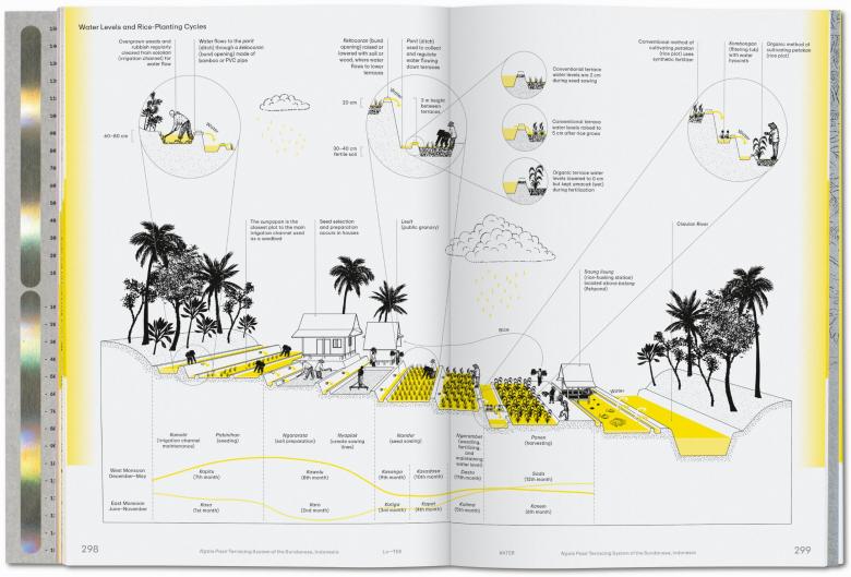 A couple of the freshwater case studies in the book are the Baira Floating Islands of the Bhumihin Krishok (above) and the Ngais Pasir Terracing System of the Sudanese (below). The first are ingenious linear vegetable gardens that sprawl across the low-lying alluvial plains of Nazirpur, Bangladesh, while the rice terraces of the second sit more than 600 meters above sea level in West Java, Indonesia. Unlike the earlier fish-oriented systems in brackish waters, vegetables and grains are the logical choice for freshwater locales. These spreads illustrate how Watson and book designers Piera Wolf and Stephanie Specht packed a lot of information into the fairly compact book via descriptions, footnotes, photographs, captions, water level notations, and Müller's illustrations. The last are particularly helpful, given the layers of information provided, the clarity of the labelling, and the carefully considered layouts.