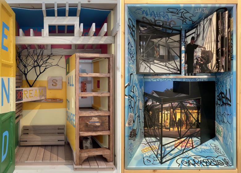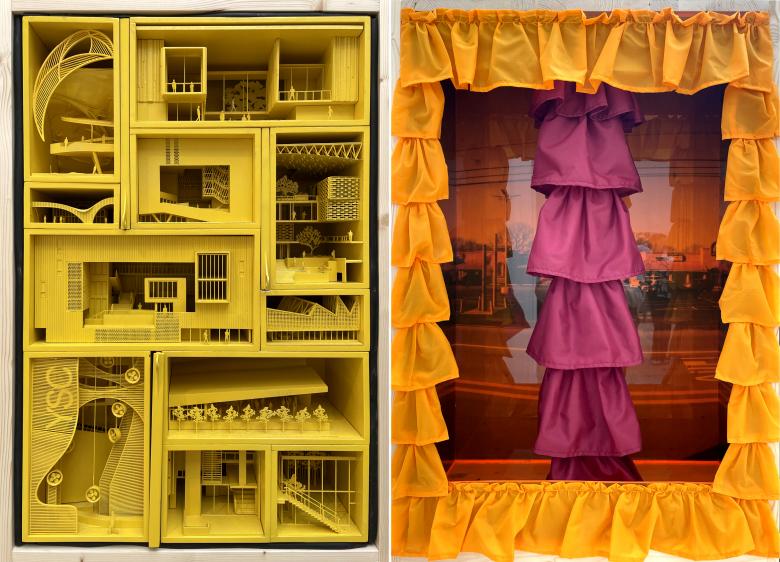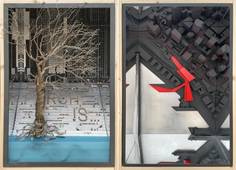 Inside, PORCH: An Architecture of Generosity features 54 contributions solicited from an open call, each one fitted into horizontal and vertical “Porch Windows,” in an exhibition design by Jonathan Boelkins. Together these windows capture the diversity of the United States, demographically and geographically, and of porches themselves, from their sizes and shapes, to their locations and purposes. Some of the displays express the designs of porches or porch-like spaces by architects, while others comment upon the social, environmental, and other roles porches serve today. World-Architects was drawn particularly to the vertical Porch Windows, which are positioned at eye height, are occasionally interactive, and have a depth that makes them spatial, not just flat representations. A few of our favorites are below, grouped into pairs based on shared traits, such as location, form, color, or apparent themes.