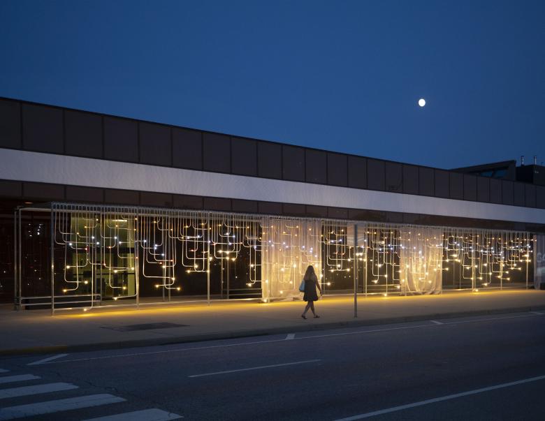 Sited on a shallow plaza in front of the Cummins Sears Building, the installation features a "wall of light" and screens that will host community programming.