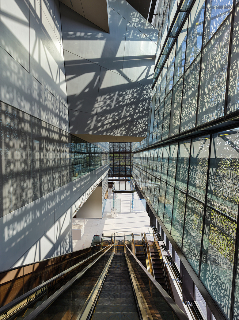 8 - The escalators connecting the above- and below-grade galleries are located behind the Corona's filigree screen, making for one of the most memorable architectural experiences in the museum. (Photo: Alan Karchmer/NMAAHC)