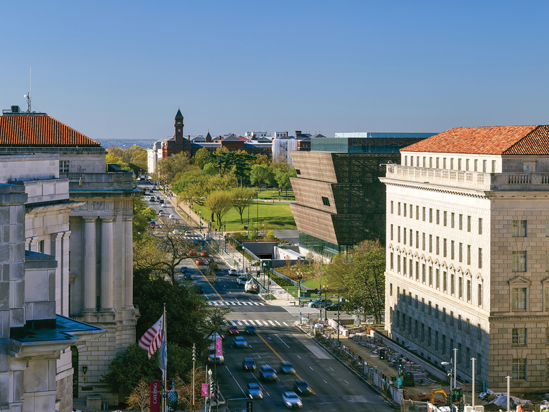 1 - The NMAAHC is located on the last remaining plot of land on the National Mall, close to the White House and the Washington Monument; here the museum is seen from the top of the latter. (Photo: Alan Karchmer/NMAAHC)