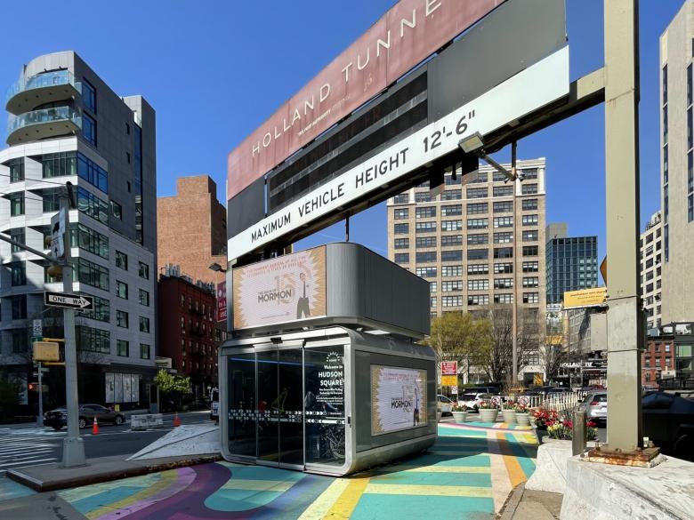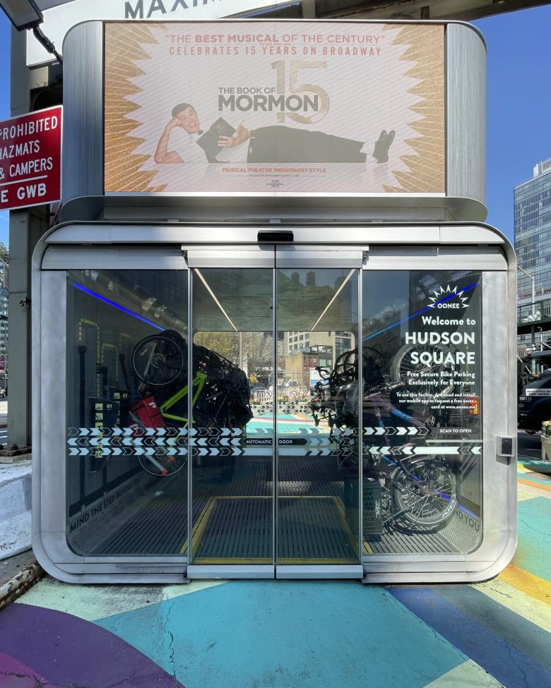 After my chat with manman at the Deliverista Hub, I walked from City Hall Park up to Hudson Square to check out one of the free, secure bike parking pods that have been installed in parts of the city but also across the Hudson in Jersey City. OONEE, FANTÁSTICA's sister company that manman co-founded with Shabazz Stuart, addresses the many bike thefts in and around NYC and the difficulties bike owners have in parking their bikes at their home and/or office. Sitting between car lanes entering the Holland Tunnel, the OONEE Smart Capsule in Hudson Square is admittedly small, but it hints at the potential of the structure, which can be expanded to fit up to 80 bikes in other locations. And with more than stations in Jersey City alone, OONEE also hints at a potential future for the Deliverista Hub—a future when it grows beyond the “seed” planted at City Hall Park.