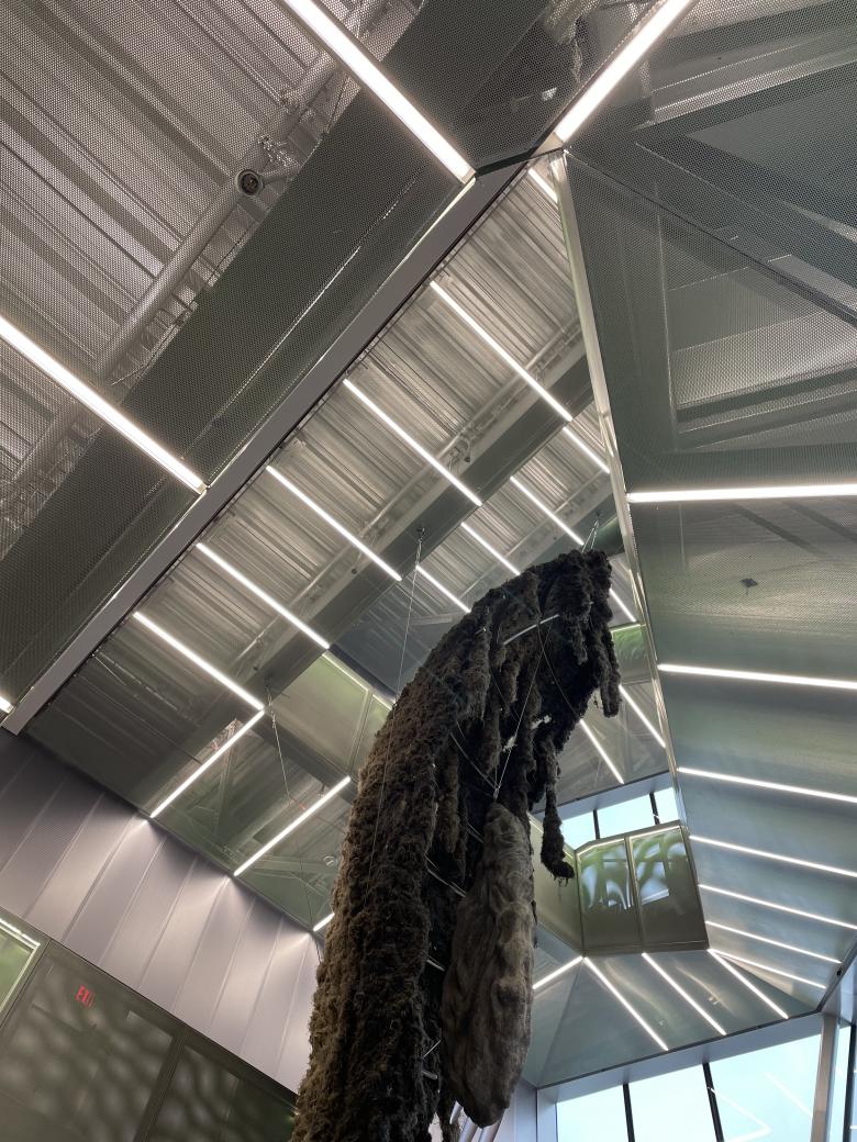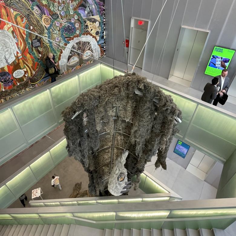 Here is a close-up of Shelter and a view of Tishan Hsu's ears-screen-skin (2025) on the second floor of the atrium. (Photo: John Hill/World-Architects)