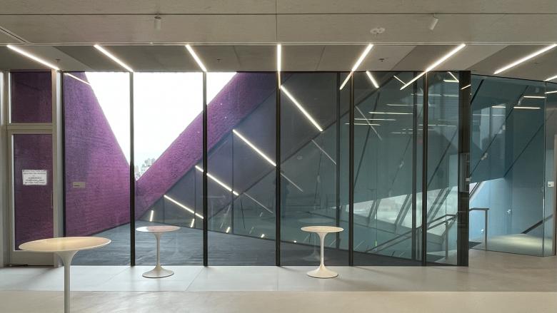Given that the Forum, Sky Room, and other spaces atop the museum are only open to the public on select days, a door limits access to these floors from the four-story atrium, which we'll now descend. (Photo: John Hill/World-Architects)