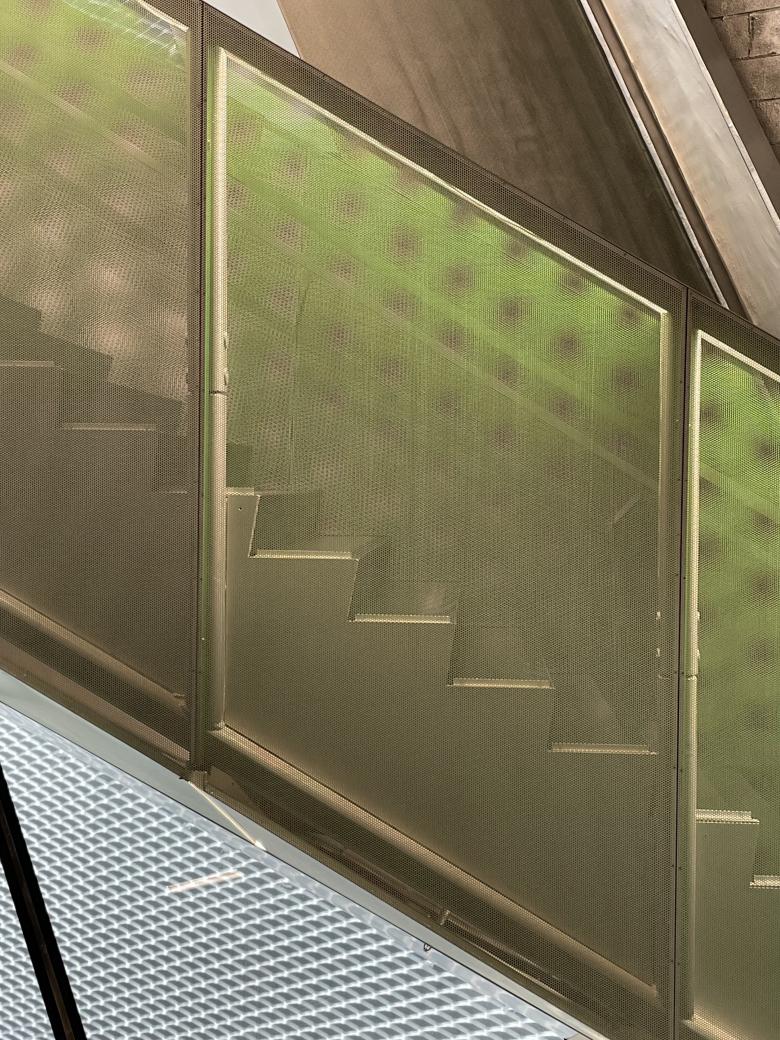 Looking up, one can see how the perforated metal of the guardrails is also used for the underside of the stairs and landings. (Photo: John Hill/World-Architects)