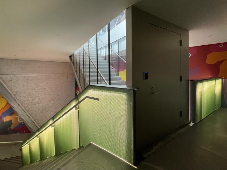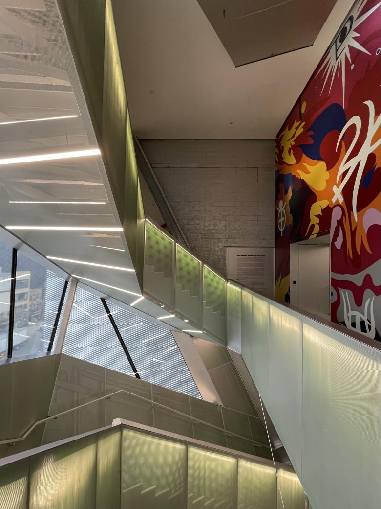 Although the artwork changes on each floor of the atrium, the architectural finishes are consistent, particularly the perforated metal guardrails with internal lighting that give the vertical space a green tinge. (Photo: John Hill/World-Architects)