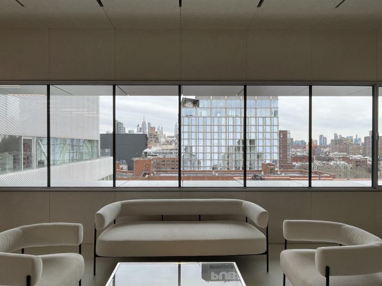 Sky Room South—as it's called on the visitor map, accompanying Sky Room North in the SANAA building—features a horizontal window (at left in previous photo) with views of the 2007 building's mesh facade and, in the distance, Herzog & de Meuron's 215 Chrystie. (Photo: John Hill/World-Architects)