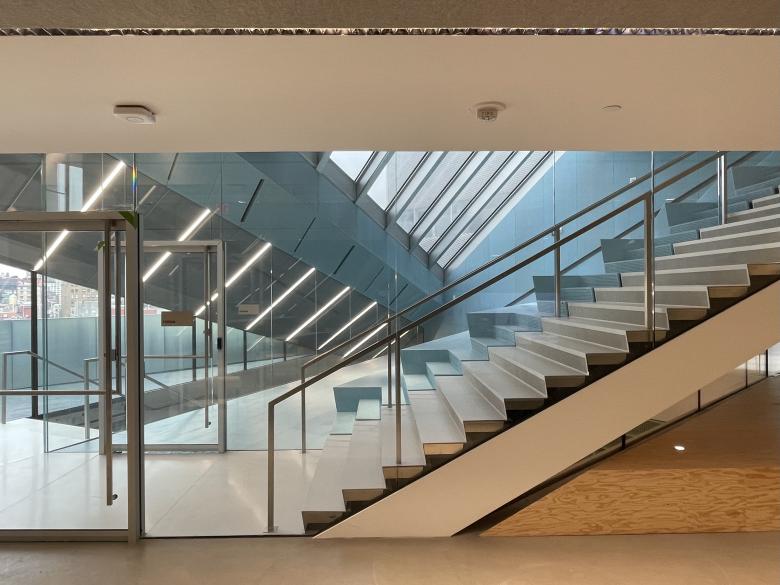 The stairs on the top three floors zig and zag their way through the different program spaces and gain natural light via the triangular terraces. (Photo: John Hill/World-Architects)