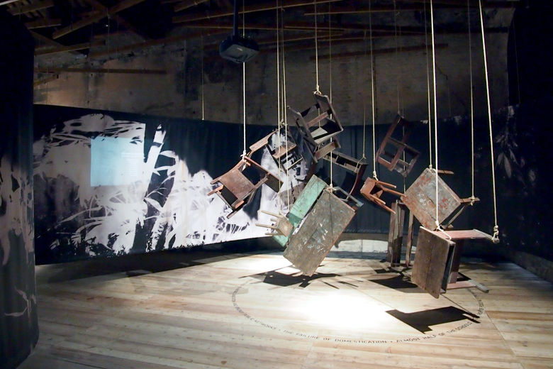 Curated by Sandra Barclay and Jean Pierre Crousse, Our Amazon Frontline is tucked away on the first floor of the Arsenale Sale d'Armi. Once discovered, the pavilion slowly reveals itself, inviting visitors to traverse a narrow path between suspended, ribbon-like walls adorned with photographs by Musuk Nolte and Amazograms by Roberto Huarcaya. Turning a corner at the end of the path brings visitors to an artistic construct made with chairs suspended from the ceiling; these chairs depict the state of the schools in the Peruvian Amazon. Beneath the chairs are statements that reinforce the inadequate conditions, such as the assertion that it takes 5-1/2 hours (three times the norm than in the rest of the country) for children to commute between home and school in the area.