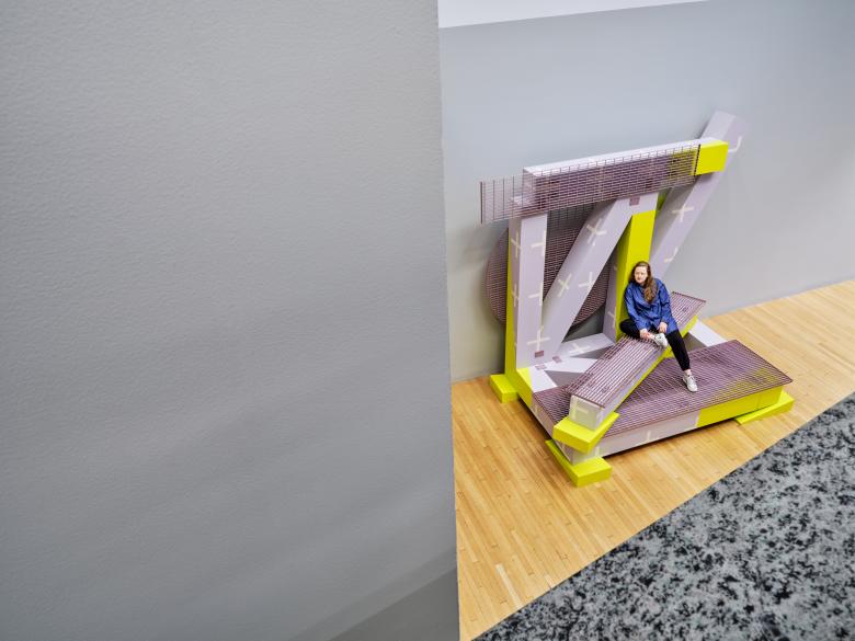 Outpost Office, the practice founded by architects and educators Ashley Bigham and Erik Herrmann, have installed Color Block No. 2 at various in-between spaces both outside and within the Wexner Center for the Arts, the building on the Ohio State University campus designed by Peter Eisenman and Richard Trott in the mid-1980s.