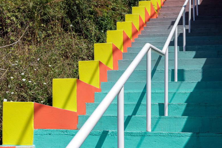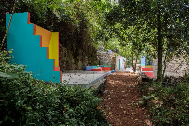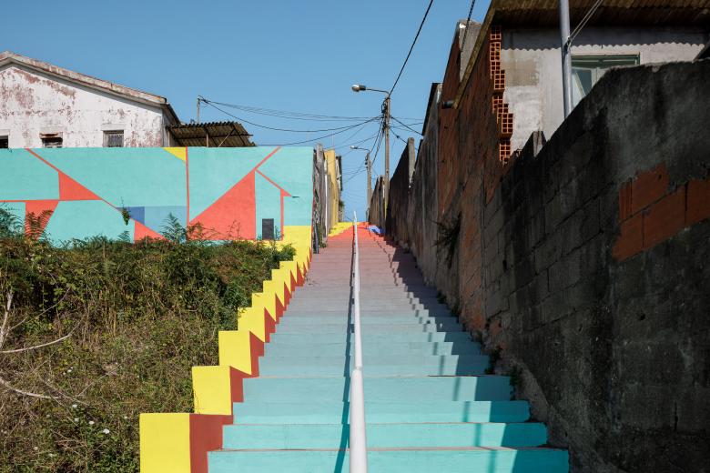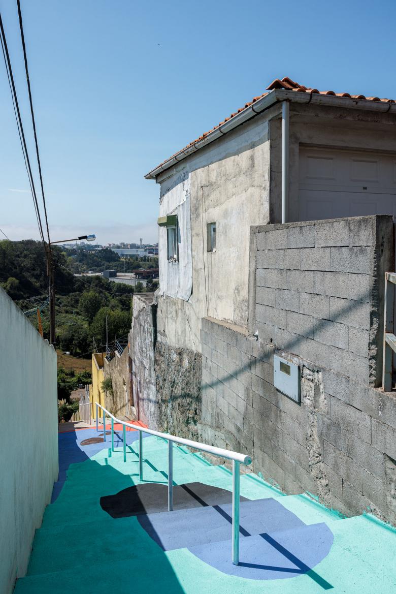 According to a project description accompanying the photographs, "the initiative is intended to demonstrate the added value that low-budget projects can bring to more 'hidden,' neglected urban spaces in our cities." The Escadinhas Footpaths project focuses on two ares in Monte Xisto: a stair leading to Rua das Escadinhas and an old ruin. Both pieces were rehabilitated before painting and had benches added to them so people can rest while walking the path.