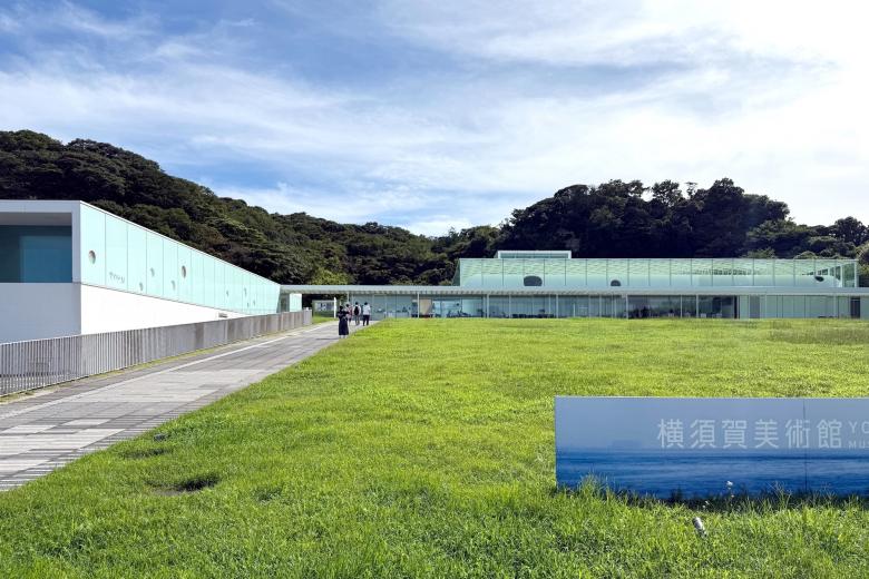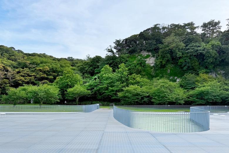 The Yokosuka Museum of Art is surrounded by mountains on three sides and is just steps from the sea on the northeast side. To protect the exhibits from salt in the air, the restaurant, museum store, and workshop sit behind glass facades on the perimeter, while exhibition space and storage are in a large shelter in the middle.