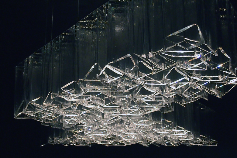 Both the Ice Chandelier and Sonnets of Babylon were made with the help of Lasvit and master craftsmen. The former involved the creation of clear glass "cells" blown into angular molds and then arranged into the resulting pattern. The latter includes a special piece made from hand-painted glass set into lead frames, the same technique as the stained glass windows from centuries ago.
