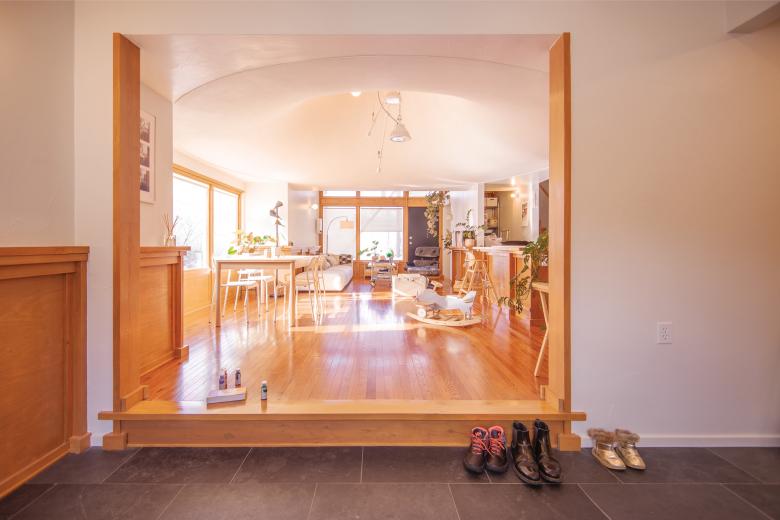 The influence of Japanese architecture is again evident inside, especially at the entry that is a step below the rest of the first floor and marks a transition from exterior to interior, from the outside world to home.