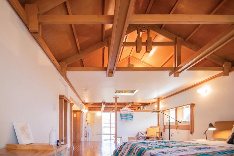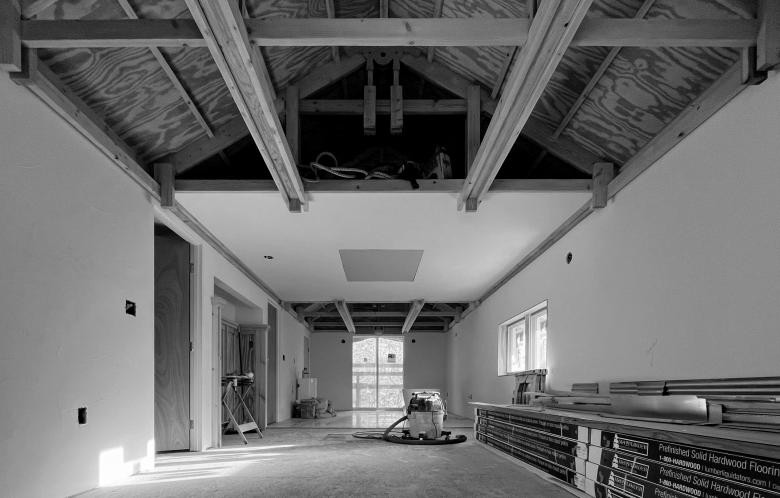 A photo of the master bedroom on the third floor, before the light well is opened up in the ceiling and floor.