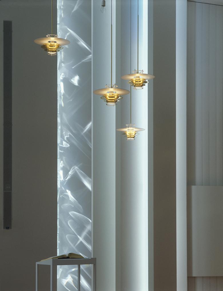 A forest-like composition of parallel walls, tall windows, and slender columns is evident in the Swedish School of Social Science at the University of Helsinki. Above is the cafe that looks onto what Leiviskä calls “a great communal living room” at the heart of the building. Another important element on display in that photo, as well as in the two photos of the Church of the Good Shepherd, is the repeated pendant light, one of numerous variations designed by Leiviskä. “These floating lights with their reflective layers of disks,” writes historian William J. R. Curtis in his contribution to the monograph, “introduce a special tension in his spaces.” The lamps also contribute to such spaces becoming “total works of art,” as Curtis says later in the essay, while clearly expressing the important role of artificial light in architecture — and quietly arguing for the active role architects should take in this aspect of architectural interiors.