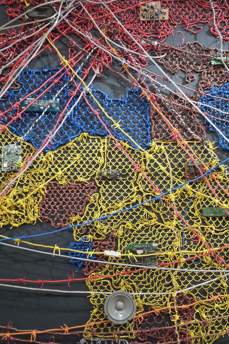 As described by the artist at Medium, "The work was conceived with electric wires to form a drawing that will trace migration patterns globally, where multitude of actors interact without knowledge of the overall situation." The wires express her interest in "the notion of the map as dynamic, ever changing, streaming and transferring data with the global flows of energies and people, as the courses of these travelers intersect."