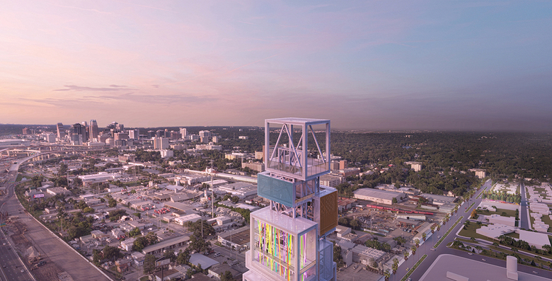 The Museum proclaims our humanity by embodying the human form as an iconic landmark for the Pulse district.  It is a figure of hope that connects the terrestrial to the celestial as the tower ascends upward. It culminates in a pulsating rainbow beacon of 49 colored columns of light, activated by human touch. The observation deck is a place to take in the entirety of the district and feel the eternal pulse of humanity.