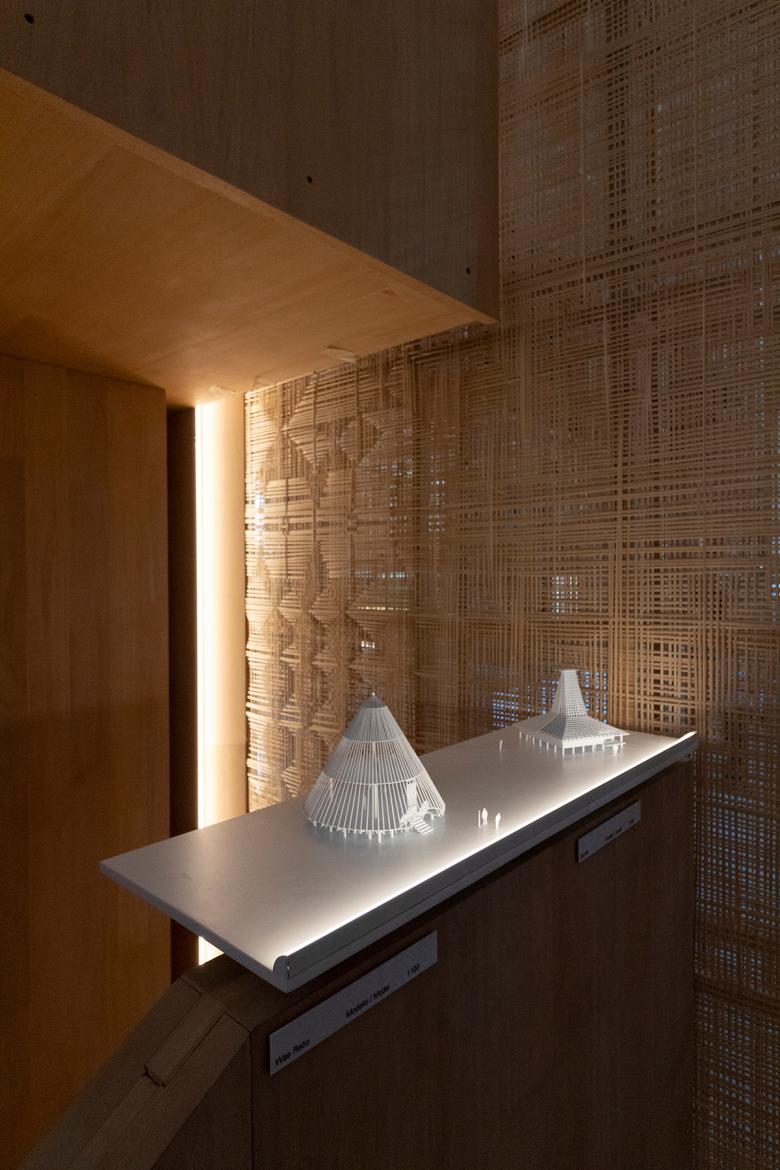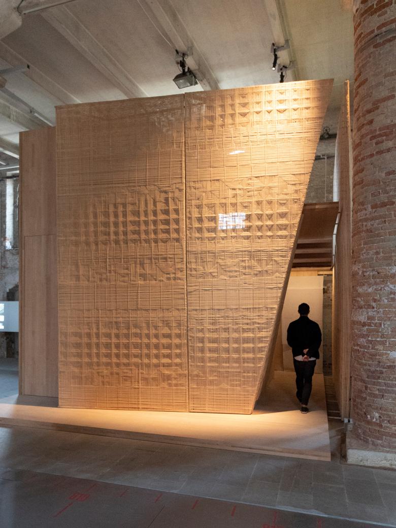 The jury also awarded two special mentions to participants in FREESPACE. One was given to Indonesin architect Andra Matin and his firm andramatin "for a sensitive installation that provides a framework to reflect on the material and form of traditional vernacular structures." The architect has focused on Indonesia's vernacular buildings that geographically span more than 5,000 kilometers on both sides of the equator. Research into the local architectural languages takes the form of small models selectively placed within a cubic structure where the visitor follows a wood-lined, Möbius-like path up, down and through an interior enclosed by woven exterior walls. It is a lovely, meditative space suited to lingering over the models that are traditional yet formally striking – hardly out of place in an exhibition of contemporary architecture.