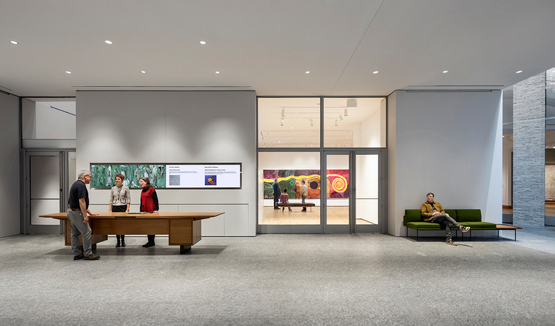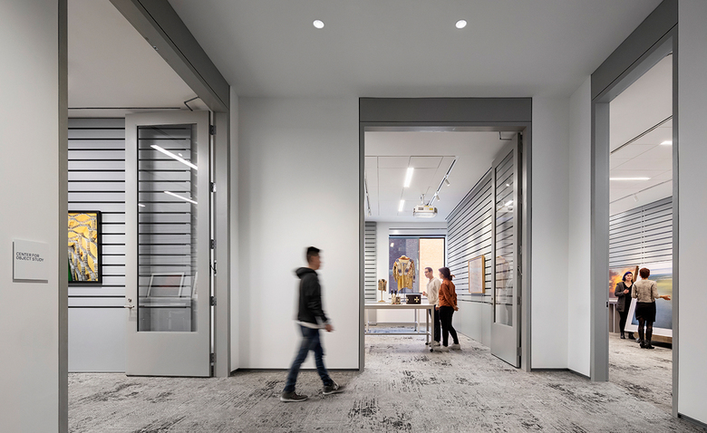 The $50 million project was predicated on "an increased demand from students and faculty to gain deeper access to the Hood’s collections [approximately 65,000 objects] through more and improved galleries and classrooms," per a statement from Dartmouth. In turn the museum comprises two floors of public exhibition spaces and study galleries, administrative offices on the third floor, and a lower level for object storage and exhibition preparation, but also the Bernstein Center for Object Study, which occupies three study galleries located off the new atrium.