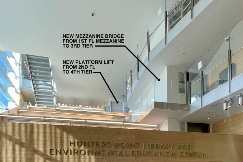 Curious to see what impact the lawsuit had on the building's interior, I headed to Hunter Point Library earlier this week to see for myself. The main reason to visit was to see the fixes to the tiered sections at the atrium, but much of the work carried out is minor and not readily visible, including “over a hundred other smaller accessibility barriers,” per DRA, “including in the bathrooms and study areas.” With photos off limit but the librarians allowing me to take the above photo, readers can hopefully see how the renovation work addressing the tiered levels is noticeable but, at least in my opinion, does not dramatically impact the quality of the space; some of this can be chalked up to Holl's firm detailing the fixes as part of the lawsuit. The fixes in this area are two and are highlighted in the image below: a new bridge connecting the first floor mezzanine, which can be accessed by elevator, to the third of the four tiers; and a new platform lift from the second floor down to the fourth, topmost tier. While this still leaves the second tier inaccessible, the bookshelves on that level were removed, so now it is only used for seating for library patrons.