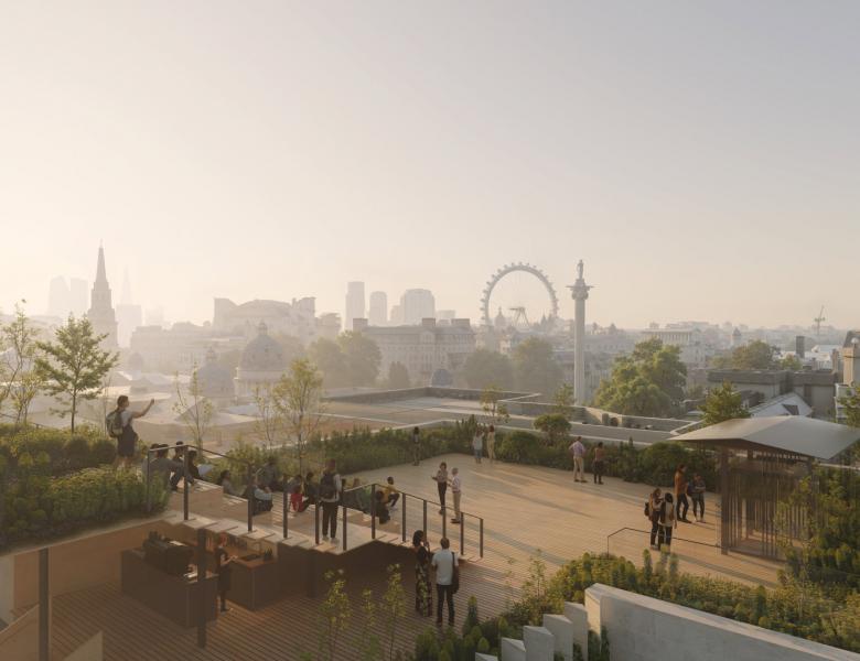 The seven-member jury* unanimously selected the design by Kengo Kuma and Associates with BDP and MICA, describing it as “both innovative and beautiful, meeting the ambition and sensitivity required for an international gallery commission.” The new wing will be located directly north of the Sainsbury Wing, on a site currently occupied by St. Vincent House, an office and hotel building owned by the National Gallery, situated just one block from Leicester Square. Given this situation, the jury further described the winning design as “respectful of the Sainsbury Wing galleries” and highlighted how “the approach to the public realm and roof garden creates a generous presence, enhanced by trees and greenery.” A new public realm will be created between Trafalgar Square on the north and Leicester Square on the north, linking the two spaces.