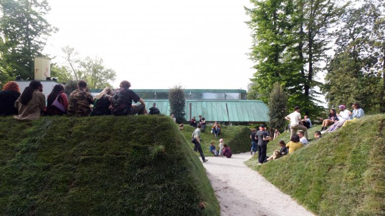 With 66 national pavilions included in this year's Venice Architecture Biennale, fewer than half of those nations have standalone pavilions in the Giardini—many of the pavilions are fitted into spaces in various buildings at the Arsenale, and some are spread across the city of Venice. With very few places to build and still have the Giardini still be park-like, the Qatar Pavilion will be built on Spazio Esedra, an empty space immediately east of the Book Pavilion, the linear building capped by a copper roof that was designed by James Stirling in 1991. The space has been used often for gatherings where the Golden Lion and other awards were given, though in the most recent Venice Architecture Biennale it was home to a landform component of the Ukraine Pavilion.