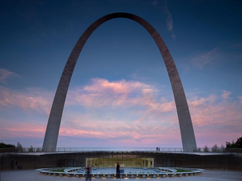 The curved arms of the glass entry and canopy clearly reference Eero Saarinen's Arch. (Photo: Nic Lehoux)