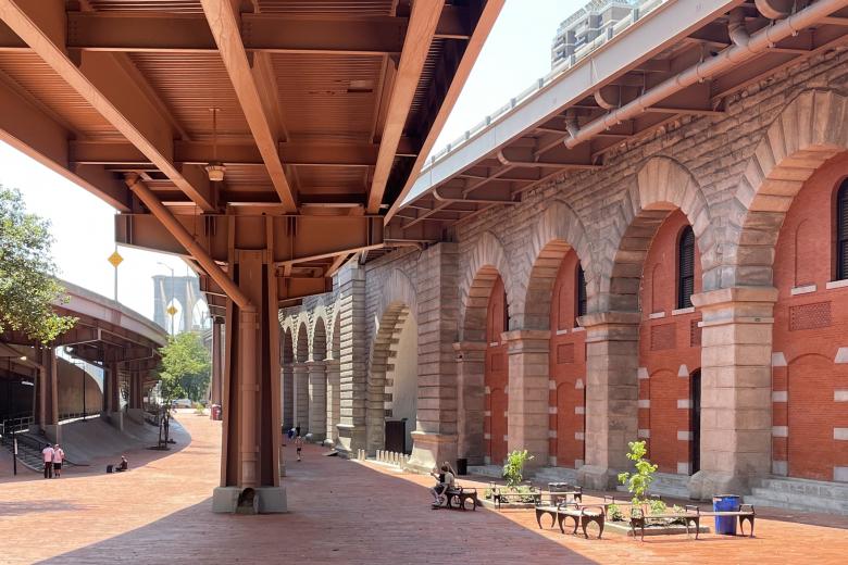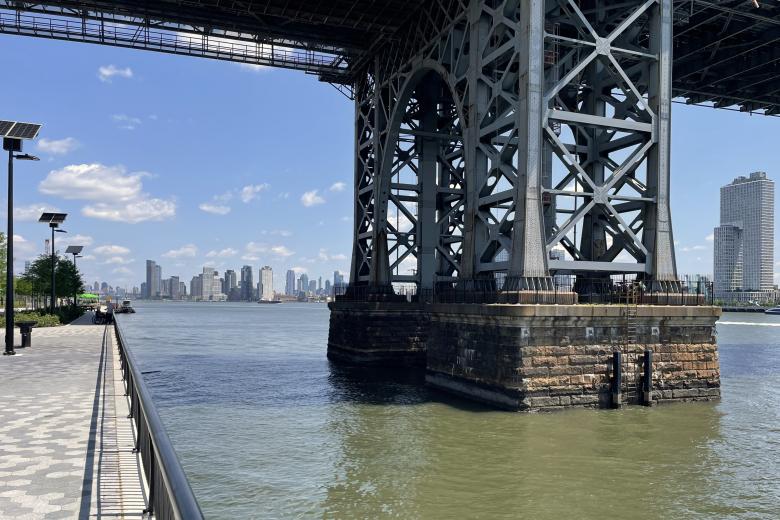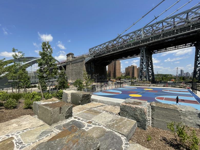 In late May, “just in time for summer,” NYC opened the first section of a rebuilt East River Park in Manhattan, part of the $1.45 billion East Side Coastal Resiliency Project that began under Mayor Bill de Blasio. The large 46-acre (18.6-ha) park, built in the 1930s by Robert Moses, stretches for about twenty blocks along the Lower East Side and East Village neighborhoods, bisected by the Williamsburg Bridge. To protect the neighborhoods from Hurricane Sandy-like storm surges, the park was completely razed and then literally raised up to ten feet (3m). This engineered approach, which replaced the more natural “Big U” plan previously in place for the shoreline, was met with protests, mostly over the removal of around 1000 mature trees from the park. Construction began in late 2021 and is reopening in phases. The first phase that opened is basically the park's midsection, with basketball courts, tennis courts, picnic areas, and landscaping beneath the Williamsburg bridge, accessed via the new Delancey Street pedestrian bridge over FDR Drive. Subsequent phases of the park are expected to be completed in full by early 2027.