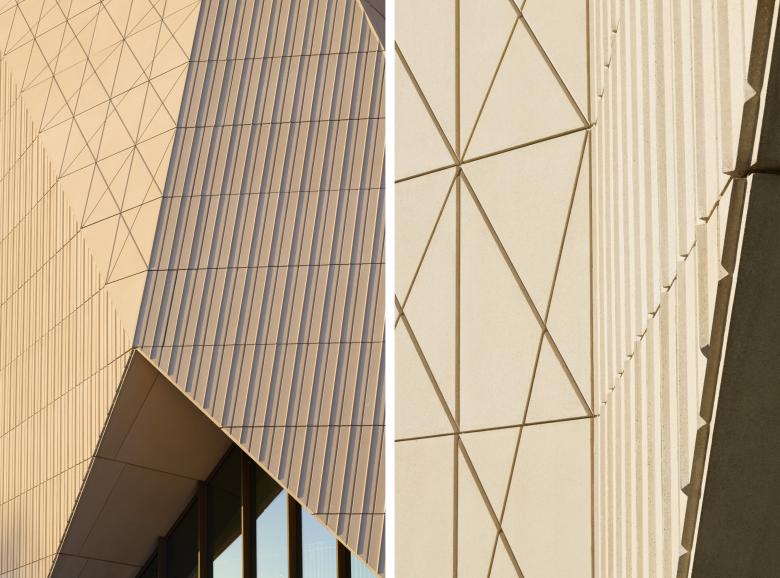 Before experiencing these spaces, visitors confront the folded facade, which is made from 479 sand-colored precast concrete panels, “each uniquely shaped and scored with profiles that reference the V&A’s distinctive logo,” per Tuomey. He continues: “The linework of the panels align to create a unified pattern along the three-dimensional folded facade that catches the changing light over the course of a day, animating the building’s exterior.”