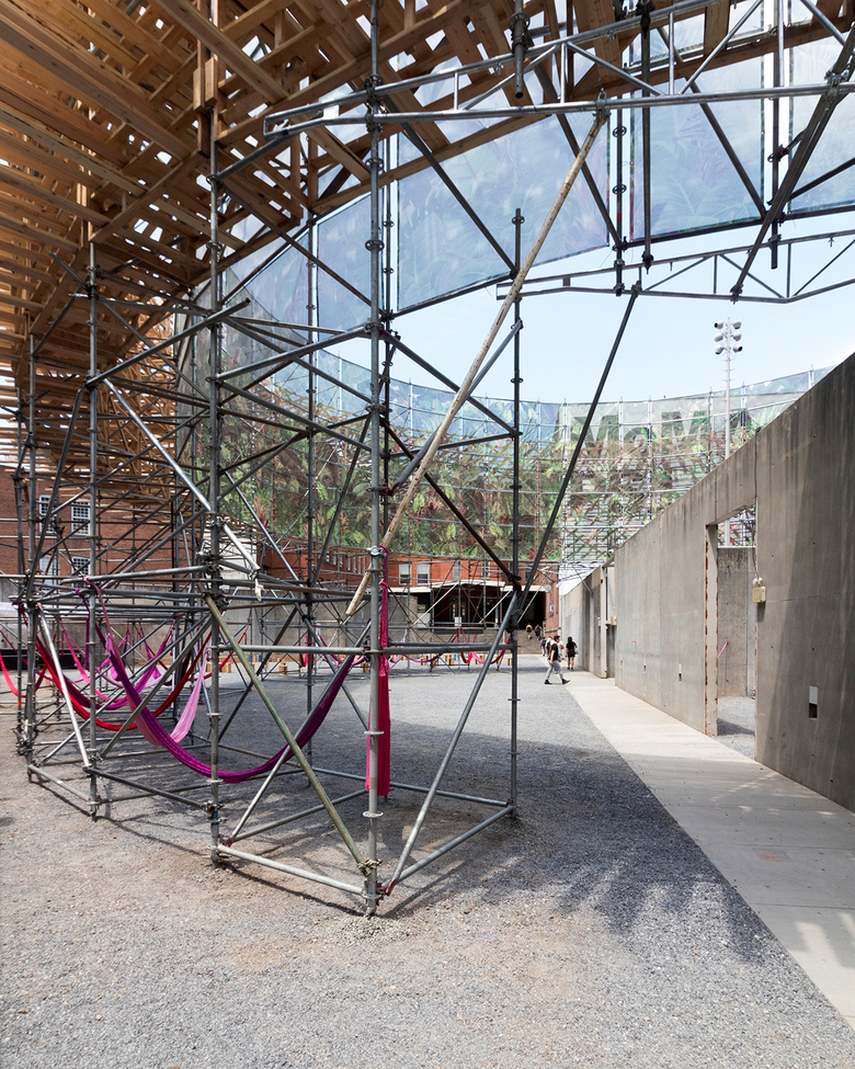 Handwoven hammocks are provided for museum visitors and Warm Up revelers.