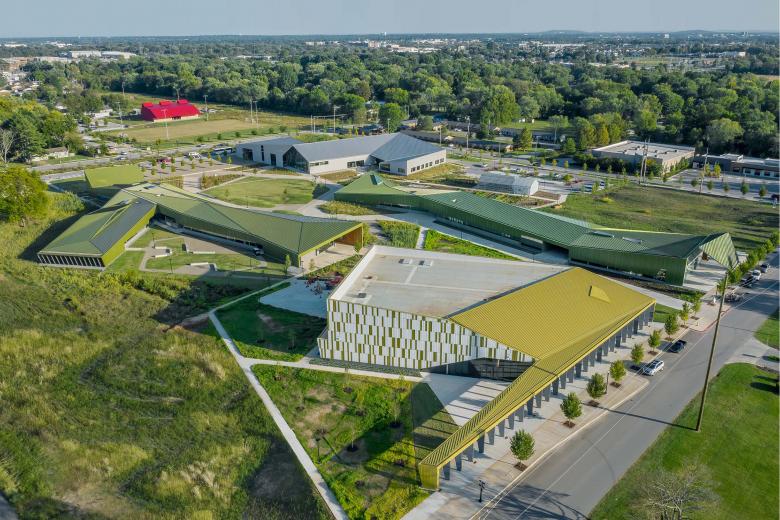 The Thaden School is a middle and high school campus on 30 acres in downtown Bentonville, Arkansas. Funded by the Walton Family Foundation, the school's origins date back to 2015, when EskewDumezRipple, with Marlon Blackwell Architects and Andropogon Associates, developed a master plan for the private school. Incorporating feedback from school leaders and community stakeholders, the team devised an “urban pastoral” campus, rooting it in the Ozark landscape and local agricultural traditions and then designing buildings that merge vernacular forms with contemporary architecture.