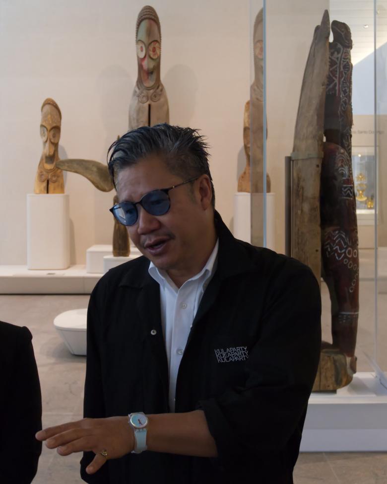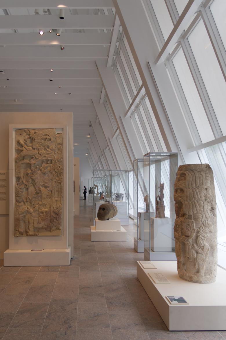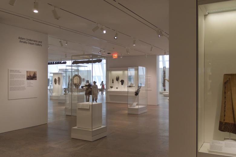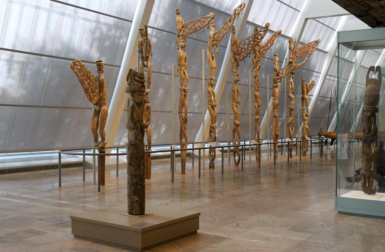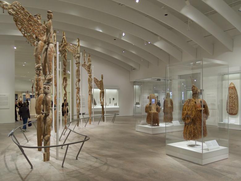 The opposite end of the vaulted space on the north side of the Rockefeller Wing is devoted to Oceanic art. Visitors coming from the modern and contemporary wing would see the view at the top of the article, with the Asmat bis poles commanding the vaulted space and justifying the hight ceiling. Originally located next to the sloping glass wall on the south (see photo near top), this group of poles had to be moved due to damage from direct sunlight. In their new location, the bis poles serve two architectural functions: dramatically terminating the view from the Africa gallery, and curving in plan to direct museum goers to continue along the diagonal sweep of the Oceania galleries.