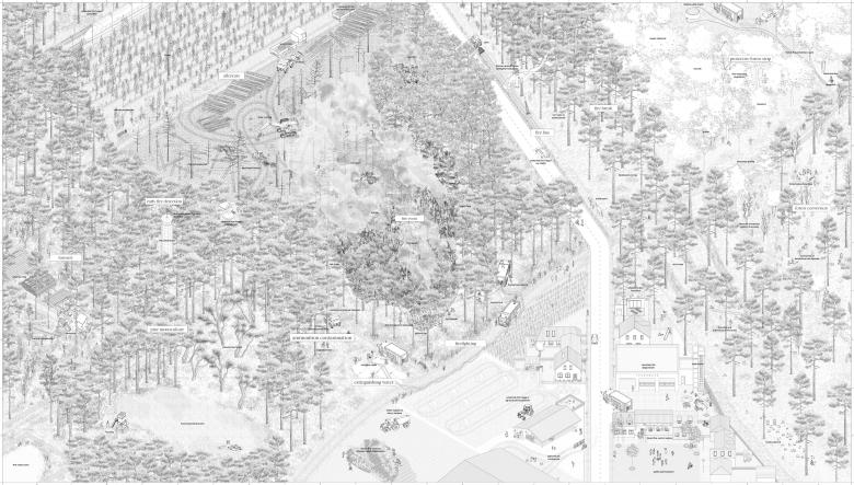 The increase in forest fires requires multidisciplinary approaches for the development of necessary measures. Architecture can be seen as a mediator of the correlations in order to make them visible. The design introduces hybrid infrastructures as mediation spaces for the prevention of forest fires.