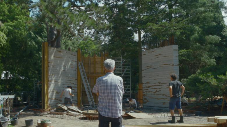 Nearly three-quarters of the 68-minute film builds suspense around the creation of the three walls, while the final quarter, picking up in pace, traces the completion of the polished floor embedded with colorful stones and the cantilevered reflective roof, which organically folds into the surrounding trees. These final sequences deliver some of the film’s most arresting moments: architects standing at a distance, carefully tossing stones into the concrete as if playing a game of ring toss; Valerio, ankle-deep in concrete, dragging a straightedge for the floor’s screeding; reinforcement meshes being meticulously arranged under a tarp; and the roof formwork projecting outward, almost like a treehouse suspended in midair. Overseeing it all is Hans, the middle-aged gardener responsible for maintaining Pinetum. Aside from the architects, he remains the film’s quiet yet constant protagonist. Whether reminiscing about a wood market in his village, lending a hand with the formwork, or tending to plants in a scenic greenhouse while classical music plays, Hans is ever-present. In a beautifully poetic juxtaposition, we see Valerio, lost in his world, passionately polishing the concrete floor to the rhythm of Hans’s music. Two craftsmen, each devoted to their craft—one nurturing the earth, the other shaping stone—united in their quiet dedication. In the final scene, as the finished pavilion stands proudly in a snow-covered landscape, a shift occurs. The architect’s role fades, and the gardener assumes ownership, tending to the pavilion as he does the rest of his beloved garden: watching over it, caring for it, and embracing it as part of his world.