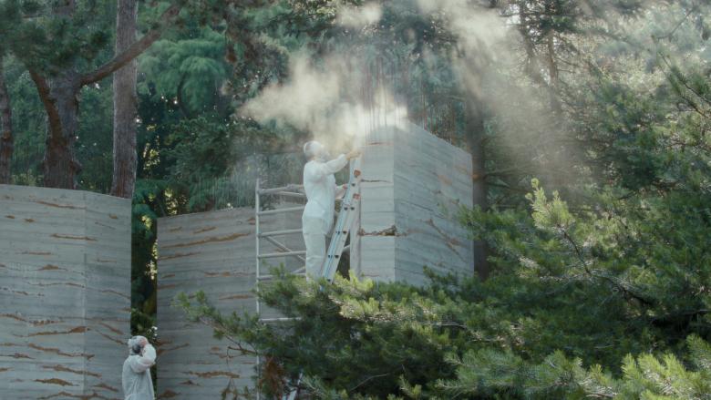 Benavides ambushes viewers by dropping them into an ongoing conversation on material, excavation, and formwork at a sand and cement manufacturing factory. The subjects all seem to know something the rest of us do not. It’s a bold choice, opening with an audacious exhibitionism of industrial concrete production for a pavilion meant to coexist with nature. This unexpected contrast raises immediate questions about compatibility and sustainability, offering an early glimpse of the film’s underlying suspense. As curiosity about the pavilion’s design takes center stage, Benavides rewards attentive viewing. Then there are his Zen-like captures of trees and greenery juxtaposed with a few gently moving elements: wagons rolling, garden gators passing, pedestrians strolling, water sprinklers spinning, concrete hoses gurgling, and workers carefully measuring their next move. These moments introduce the site and its key players. The film captures the essence of public placemaking, accentuating the involvement of the architects and gardeners, but also the inquisitive passersby who pause to observe, ask questions, and engage with the process. It portrays the architects in their most natural state, building the pavilion, one wall at a time. With the knowledge of an architect, Benavides positions his camera at deliberate angles, offering close-up views of materials and construction techniques, and transforming otherwise ordinary processes into compelling visuals. This is especially evident in capturing Valerio’s intuitive, literally hands-on design approach, as he meticulously directs how much stone and sand to add manually between layers of concrete mix. These details become essential ingredients in Benavides’s cinematic composition, drawing viewers into the process. And just as a passerby in the film repeatedly remarks, “I find it all so nice,” we, too, are left with a sense of amazement at the unfolding craftsmanship.