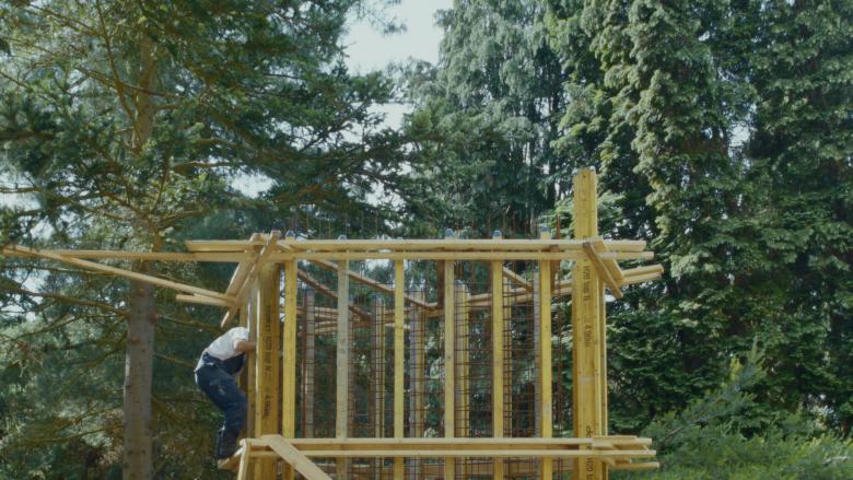 Beyond the almost ritualistic practice of construction, Benavides infuses moments of lightheartedness, capturing the camaraderie and quiet joys of the building process: workers wrapping a foot in plastic to shield against torn boots; Tim meticulously grinding his coffee beans with near-reverence; an upright wooden plank seemingly moving on its own between the trees; architects suiting up in full plastic overalls prompting laughter; the intentional one-minute wait for a machine to restart. Dialogue is sparse, yet these fleeting, playful moments speak volumes.