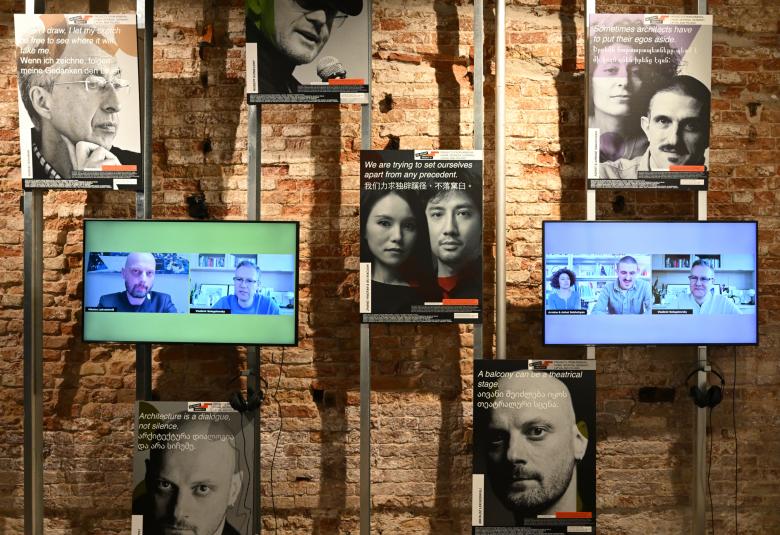 Architects who see the Biennale as heavy proselytizing over environmental and social issues will find a welcome relief in No Doubt About It's focus on ideas and creativity in a variety of architectural projects: three theaters, two museums, and a residential block. The projects are explained in the usual models, drawings, and photos or renderings (depending on the stage of the project), but also in video interviews that Belogolovsky conducted with each of the architects on Zoom; the last are mounted to studs on the back wall, alternating with some of the filmic posters designed by Peter Bankov for the exhibition. Standing out to this visitor among the half dozen projects were Zaiga Gaile's reimagining of the Richard Wagner Theatre in Riga, which is explained in a huge cutaway model, and Nikoloz Lekveishvili's project for Metra Hills in Tblisi, a residential development that is wrapped in a continuous balconies: a reinterpretation of the traditional “gossip balcony” in Georgia.