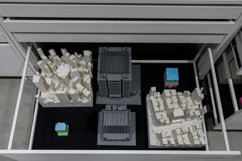 Stepping further inside, the majority of the exhibition consists of flat-file storage, but immeidately drawing attention is an egg-shaped object, designed by Lau, in which one or two visitors can literally step inside and virtually immerse themselves within Hong Kong's famous network of elevated walkways. Made in part through AI technology, the 360-degree, audio-visual experience is fun but also far removed from the traditional bamboo construction in the courtyard. Occupying the wide gulf in between these two realms is the archive: drawers with drawings and models documenting postwar buildings in Hong Kong that are “remarkable,” in the curators' words, but also “ordinary,” “overlooked,” and at risk of being demolished or dramatically altered. These include public housing and housing estates, but also the municipal services buildings that combine numerous public functions in large-scale structures; the curators appreciate the MSBs so much they call them “social condensers extraordinaire.” With dozens of flat files and dozens more drawers, there is plenty to look at and absorb in this Hong Kong Archive.