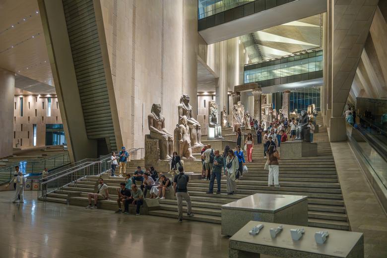 A sprawling 50-hectare (123-acre) desert site north of the pyramids and south of the new Sphinx International Airport was available. In 2002, Dublin's heneghan peng architects won the international architectural competition that attracted 1,557 entries. A quarter of a century of planning and construction went into the project. Anyone who approaches the complex, having navigated the confusing periphery of multi-lane highways, subway bridges, extensive bus and car parking lots, and rigid barriers and checkpoints, and stands in front of the pyramid-shaped entrance to the monumental structure, will not be surprised by this. Upon entering, visitors are immediately overwhelmed by the vast entrance hall.