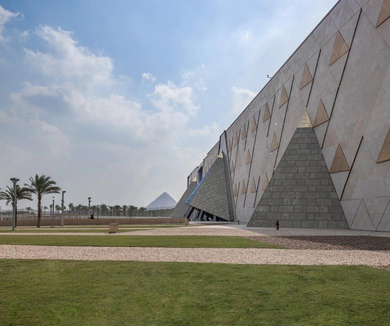 The new GEM stands outside the gates of Cairo, where the architects have masterfully structured the required building mass while still giving it an appearance of weight that can enter into dialogue with the ancient ruins two kilometers (1.25 miles) away. The triangle, which dominates the building inside and out as a structural and decorative motif, also relates it to the geometry of the pyramids.