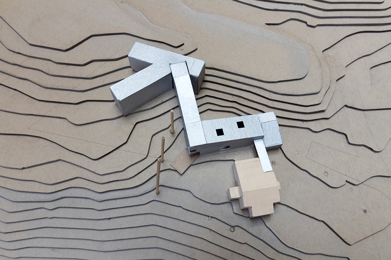A study model of ArtArc, the almost completed building that joins to a 1940s cabin that has been renovated for visiting fellows.
