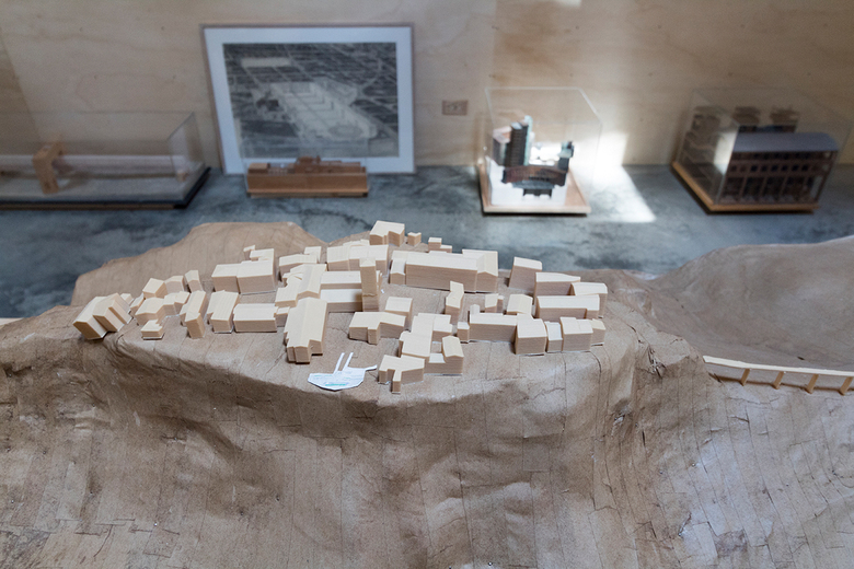 The center of the gallery is occupied by a series of tables and models, the former housing some sketches of Rome by Zarina during her American Academy fellowship and letters that Holl wrote to his family during his Rome studies, and the latter pertaining to Civita di Bagnoregio, a small hilltown about a two-hour drive north of Rome. Civita, for short, was the base for the UW Italian Hilltowns program that Zarina started and where Zarina retired with her husband. The couple restored many buildings there, a town so small and isolated it can only be reached by a footbridge. Built by the Etruscans on flimsy tuff rock, Civita was added to the World Monuments Fund list of the 100 Most Endangered Places in 2006, due in large part to Zarina's efforts.