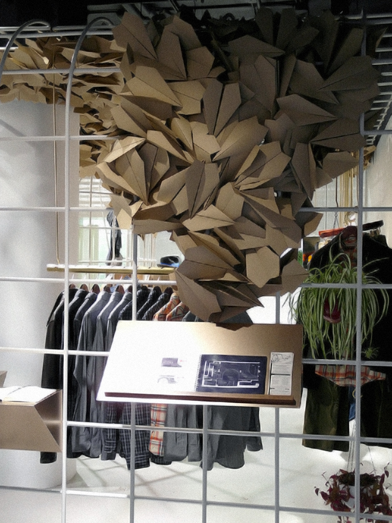 I was surprised to learn that a couple of OMA's recently completed projects are tiny compared to their design for 425 Park Avenue and even Cornell University's Milstein Hall from 2011; they are closer in vein to Rem Koolhaas's Prada flagship in SoHo than the projects that have occupied OMA this century. One is a shop on Elizabeth Street in Nolita (North Of Little ITAly) for Raleigh Denim, a jeans maker from North Carolina. Mr. Shigematsu was influenced by the company's flagship store in its home state, where the company's designers crafted their own unique interior. His belief that fashion designers may be better suited to creating the ideal environment for displaying their wares, rather than architects, prompted him to develop a "curatorial grid" for suspending clothes and mounting decorations, such as the brown paper airplanes that echo the North Carolina original. So instead of imposing a design whose expression may need to be replaced by a new every year or two (like Prada, which has been slightly renovated since its 2000 opening), OMA installed a structure that gives Raleigh the power to modify the interior at will (like Prada's long image wall facing Prince Street). It is a refreshing attitude to retail design that is at odds with architects trying to put their stamp on a store's space.