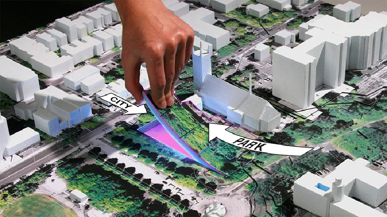 Many of the projects that Mr. Shigematsu and I talked about are not ready for public consumption, but one that is well on its way to completion is his 2010 competition-winning design for the Musée National des Beaux-Arts du Québec (MNBAQ) in Québec City. The form echoes the daring cantilever of Milstein Hall, but here it is a three-story building whose gradual stepping creates an enclosed public space. The inverse of this grand space facing the city is an extension of the park over the roofs, as the diagram above illustrates.